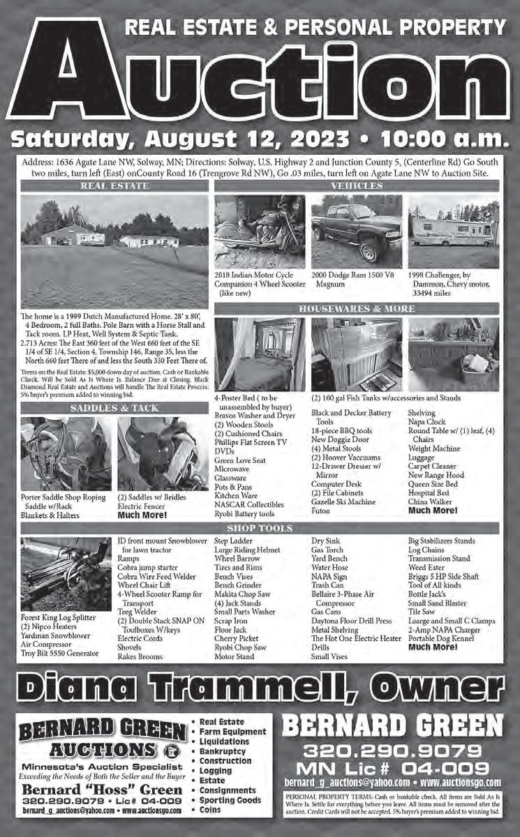 acommercialdriver ’s permitatthetimeofapplication. Joinourteam!MnDOT is agreat,family-friendlyplacetowork withgoodbenefitsand apensionplan. To viewthepostingandtoapplyvisit www.mn.gov/careers JobID63600.OpenforapplicationthruAugust7,2023. MnDOTisanequalopportunity/affirmativeactionemployer with astrongcommitmentto workforcediversity. 218-333-9200 | service@bemidjipioneer.com P.O. Box 455 | Bemidji, MN Place your ad online at bemidjipioneer.com or contact: service@bemidjipioneer.com Employment ads: call 888-514-4473 or email jobs@jobshq.com Classifieds As good as gone! BuyLine SHOP EQUIPMENT & TOOLS Coleman 27 gal. air compressor Guardian Drill Press Craftsman 10” Radial Arm Saw Tool Shop Band Sander Pen State Dust Collector 2-two piece toolboxes Craftsman Scroll Saw w/stand Rigid Table Saw Rigid Band Saw MiterSaw Ace Bench Grinder Wood organizers Craftsman shop stool Work benches (3) four plasticshelves Wagner heat gun Torch set 51pc socket set Pneumatic air nailer Nail belts Bar clamps Come a long 3-ton floor jack LP space heaters LP tanks Sawhorses Regular run of hand tools 2-wheelcart Propane heaters Transmission lift Wood rack full of dimensional wood SO MUCH MORE! LAWN & GARDEN TroyBuilt Rear Tiller Craftsman T3000 Rider Craftsman push mower Yard Machine String Trimmer Remington Rodeo Pro Chainsaw Fertilizer Spreaders Garden Bench Shopping cart Gardentable BirdBaths Lawncart Garden tools and rack Yard Decor Poulan Chainsaw Chain sharpener Tree saws Shark Ice Auger Golf Clubs Craftsman weedeater Tomato cages Rolls and pieces of garden wire Green treated posts Hoop Frame SO MUCH MORE! FURNITURE & SO MUCH MORE! Amish made Oak table(2) captains chairs (4) regchairs - (4) leaves Stepstool 4-shelf bookcase w/Lift glass doors 3-Cushioned Sofa (2) recliners (2) white cabinets 4-tiershelf Desk/chair Computer desk (8) office chairs Oak TV Stand Night stands Patio table 4 chairs 5-drawerdresser Microwave cart Large vase Bakersrack Brinkman gas grill Firepit Shepard hooks VirioTV Ceramic heaters Sewing machine AUCTION LOCATION: 1841 WHISERWODD COURT SW, BEMID.JI, MN Rose has decided to sell all personal property, and move closer to her children in Michigan. She will sell her late husband’s wood working tools, Lawn and Garden, and Home furnishings at Auction. Much More Too Numerous to Mention! Very Clean well kept items. Come and enjoy this auction! Roll up Tonneau cover for a short box pick up. $400. Matthews Switchback bow with case and extra arrows. Great shape. $400 218-766-4595 HELP WANTED TRANSPORTATION AND LOGISTICS Class A CDL Delivery Driver - Bemidji Up to $33/Hour! Henry’s Foods values our team members and the experience they bring to our customers and company! Class A CDL Drivers start at a minimum rate of $28.00 per hour. Years of experience are considered at the time of hiring and you could earn up to $33.00/hr! Along with a 4-day workweek, full-time team members are eligible for: • Company Sponsored Health Insurance • 401k with up to 4% Company Match • Company Paid Life Insurance • Company Paid Short-term Disability Insurance • Paid Time Off • Paid Holidays • Supplemental Dental, Disability, Hospitalization, Accident and Cancer Policies available at a group rate. • Well maintained fleet • Employee Discount • Monthly cell phone allowance We are looking for reliable and professional drivers who have a passion for providing excellent customer service to deliver to convenience stores, restaurants, schools, hospitals, and other food service entities. Apply online at henrysfoods.com or send completed app to: Henry’s Foods, Attn: J. Waldorf, PO Box 1057, Alexandria, MN 56308 MISCELLANEOUS FOR SALE WANTED TO BUY 1,000 to 2,000 lbs Hand Harvested Wild Rice Call: 800-882-4902 Assistant Gambling Mananger North Country Snowmobile Club is seeking a qualified individual to assist the gambling manager. Applicant must be available Wednesdays and Fridays. Applicant can expect 12 to 15 hours per week. Main duties will be to audit closed pull tab games. More responsibilities may be added at a later date. Applicant must be bondable and able to pass a drug test. Starting wage is $13.75 per hour with a raise after the 3 month probationary period is satisfactorily completed. Please apply to ncsclub@paulbunyan.net. North Country Snowmobile Club MN Gambling License #02333