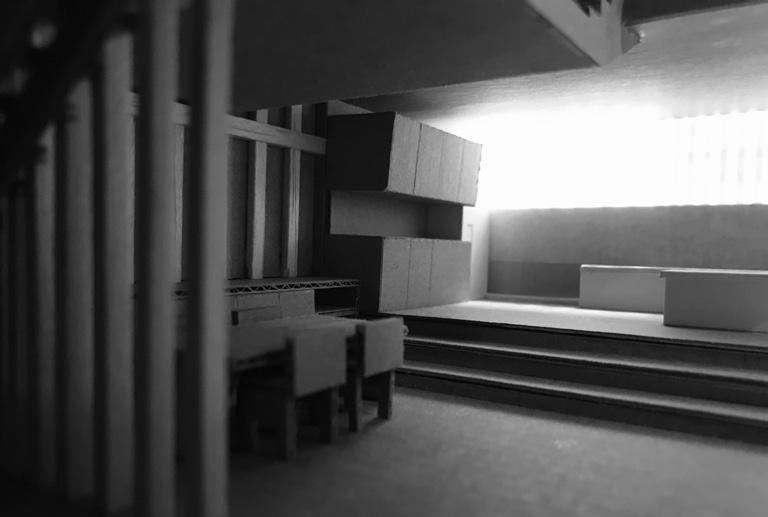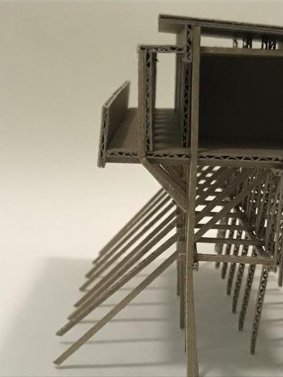 The architecture is presented and designed like a platform by the architect which the building shored by many slim timber posts. The most challenging part of making the model was the posts since the construction was relatively complex. However, making the model is an excellent way of understanding and studying a building. Therefore, after the model was finished, many characteristics of the building can be clearly appreciated such as the spatial quality, the composition of the space and the proportion of the building. Although it cannot compare with the experience on site, it helps to image a right configuration of space and form.