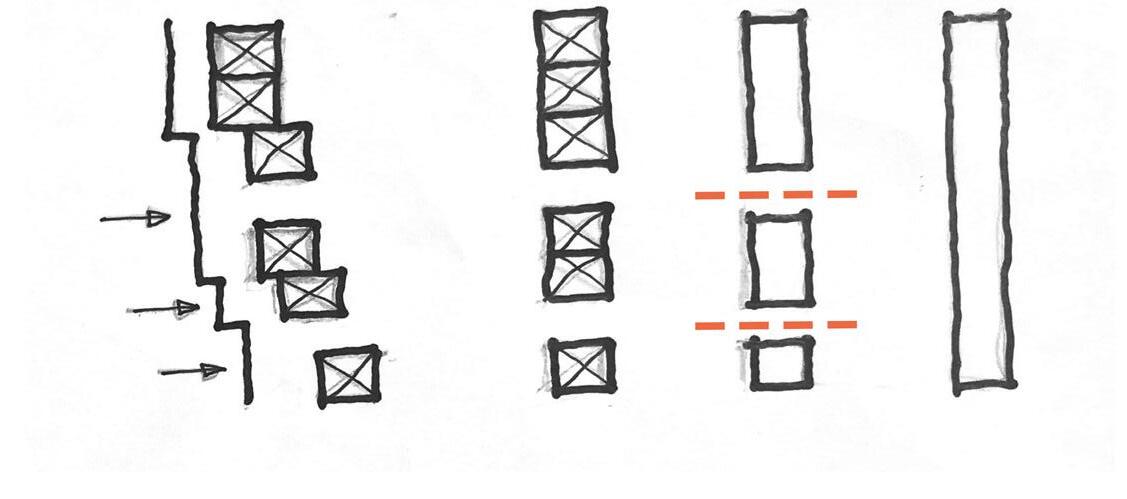 The site is devided into blocks with two gaps for the circulation purpose. One of the paths is the extension of the tunnel. In order to provide a different spatial experience, I create the fronting of the design with depth. For example, some of the blocks are pushed inward.