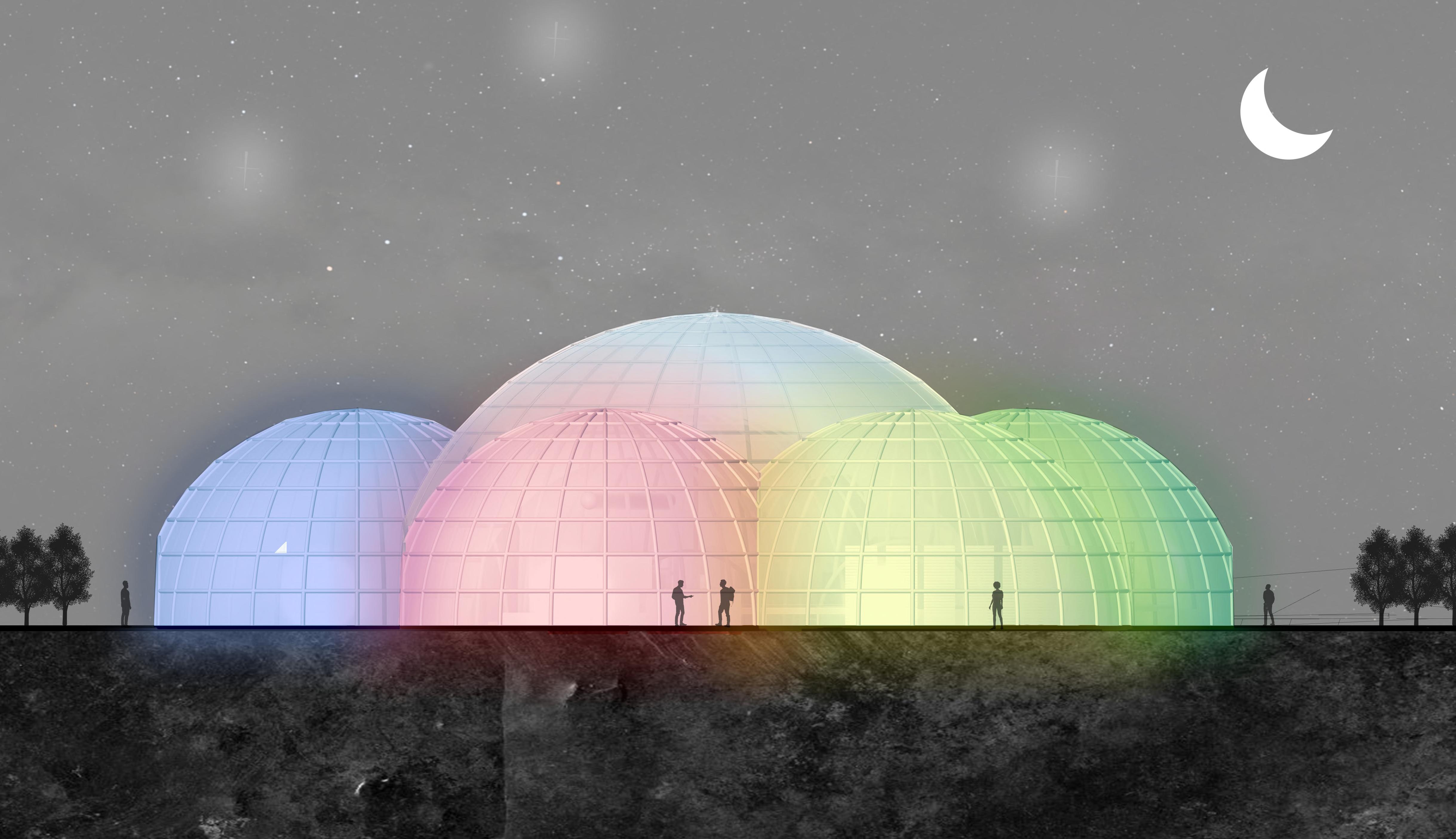 The ETFE panels has a lighting feature, it is lit up at night for aesthetic purposes since ETFE is see through so the light can shine and pass through it and iluminate. Also each colour represents a phase in the production system, so when there is ingridients being made the domes light up to be able to differentiate between the domes.