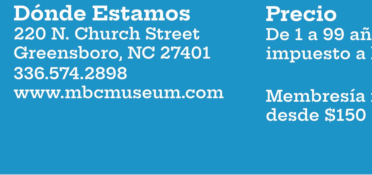 Para obtener más información sobre el museo y sus actividades comuníquese al 336-574-2898 o escriba a comeplay@mbcmuseum.com