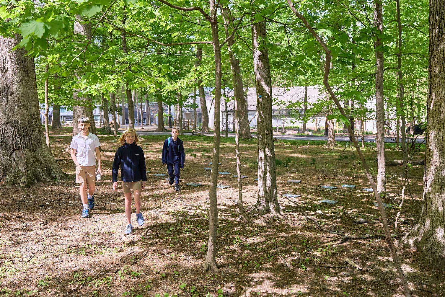 Joan Fox works with students to prompt sketch ideas on the grounds of Boxhill.