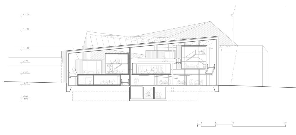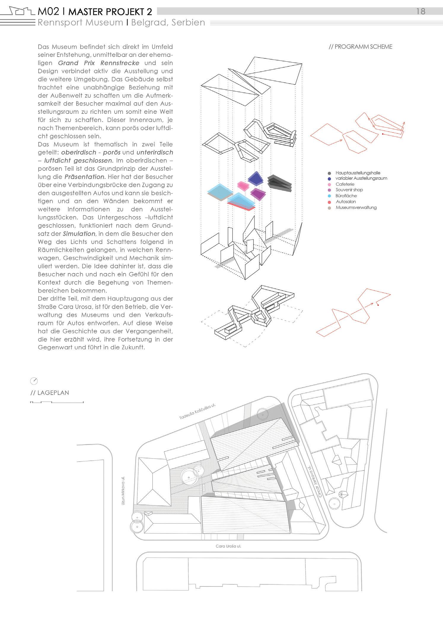 eine spezifische Besonderheit dieses Ortes ist, verfolge ich dieses Prinzip in meinem Entwurf, um den ‘genius loci’ und die Sichtachsen zu behalten. Drei in Höhe und Breite unterschiedliche Baukörper bilden im Zusammenspiel mit der Landschaft ein Bauensemble, das sich als Treffpunkt der künstlerischen und interkulturellen Szene Belgrads versteht. Es bietet Raum für Ausstellungen, für die Entwicklung und Präsentation