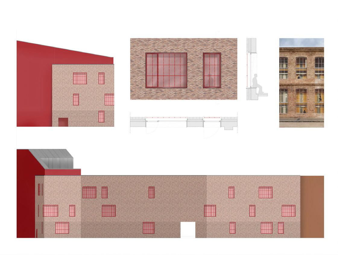 Die Nordfassade wird als vorgehängte, hinterlüftete Klinkerfassade ausgeführt und erhält neue Fenster in unterschiedlichen Größen. Für die Verkleidung werden wiederverwendete Klinker aus dem Rückbau der alten Nachbargebäude genutzt, was nicht nur den historischen Bezug wahrt, sondern auch den Nachhaltigkeitsaspekt betont.