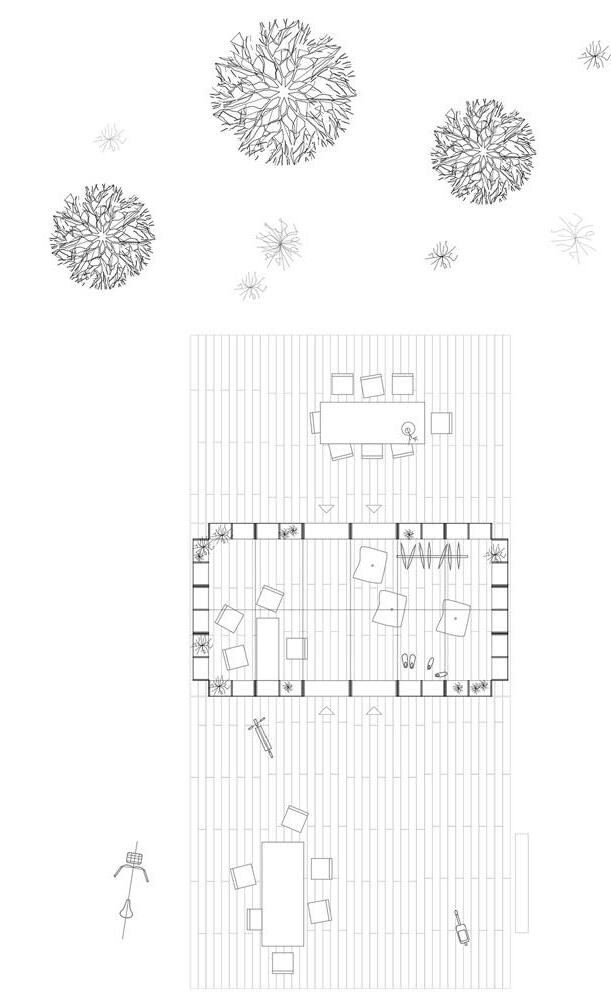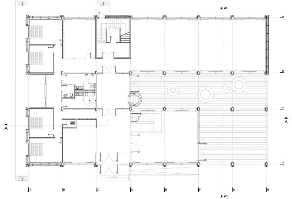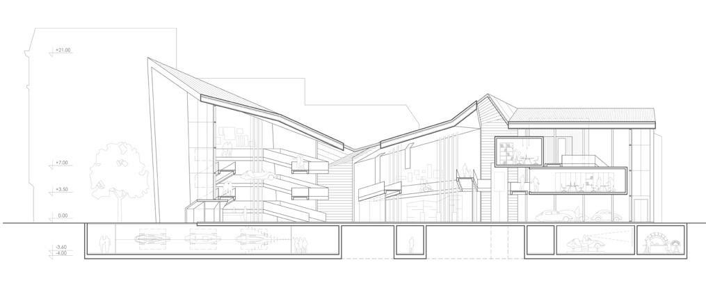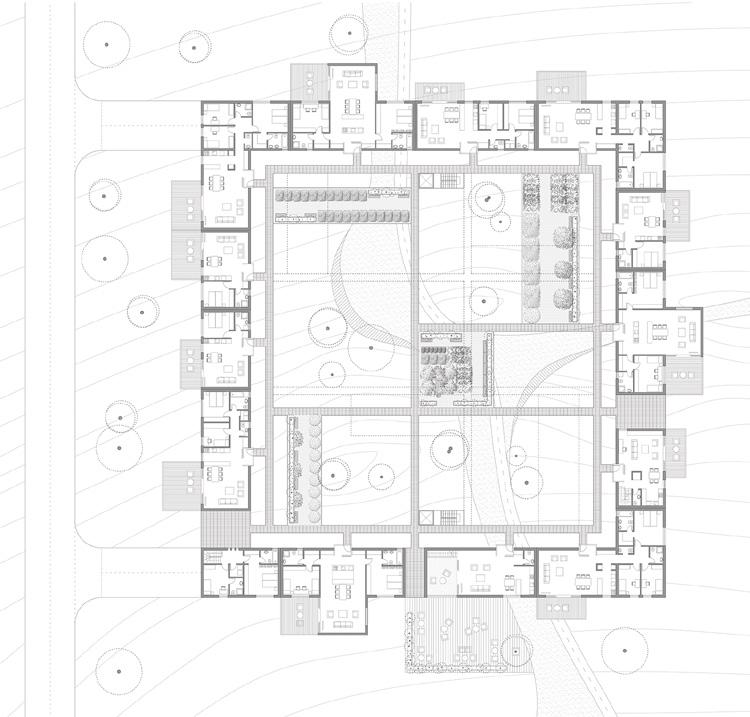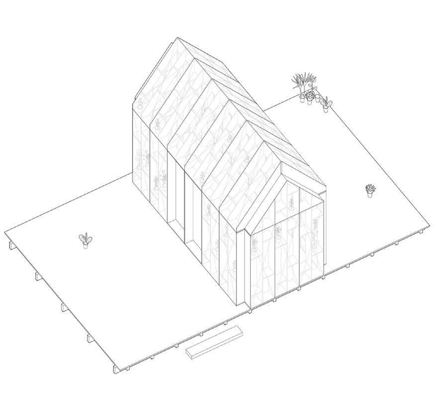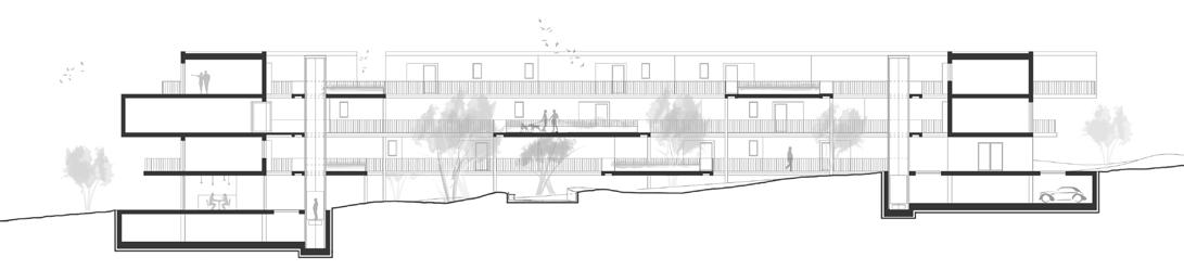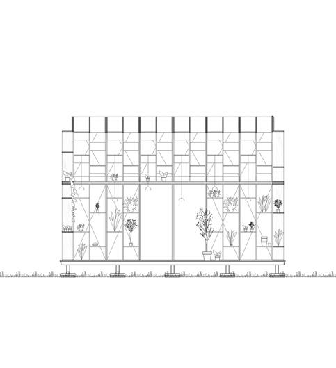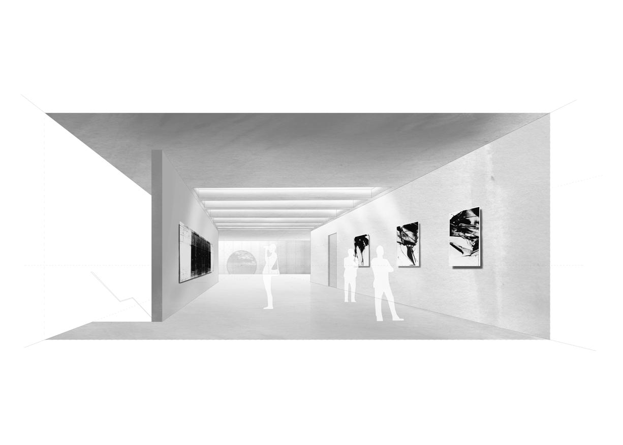 In diesem Gebäude, wie auch im Wohnbau ist vorgesehen, dass die Paneele im Fenster- und Türbereich je nach Lichtbedarf aufund zugemacht werden können, sodass die Räume eine kontrollierte Tageslichtquelle haben. Im EG ist ein kleiner flexibler Vortragsraum geplant, der einen direkten Zugang zum Plateau ermöglicht. Im ersten OG sind zwei Einzelstudios für Gruppenarbeiten und kleine Fachbibliothek. Im zweiten OG befindet sich die Verwaltung der Galerie und des Bildungsprogramms mit einer Dachterrasse.