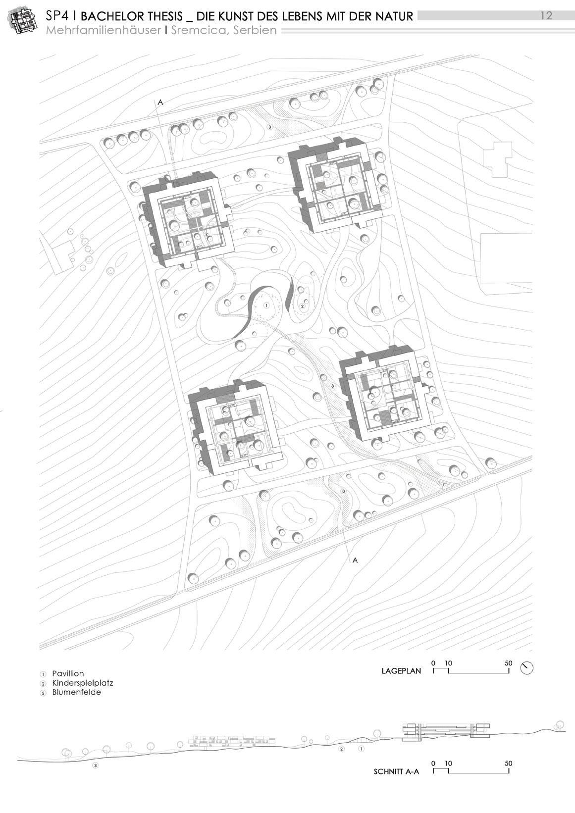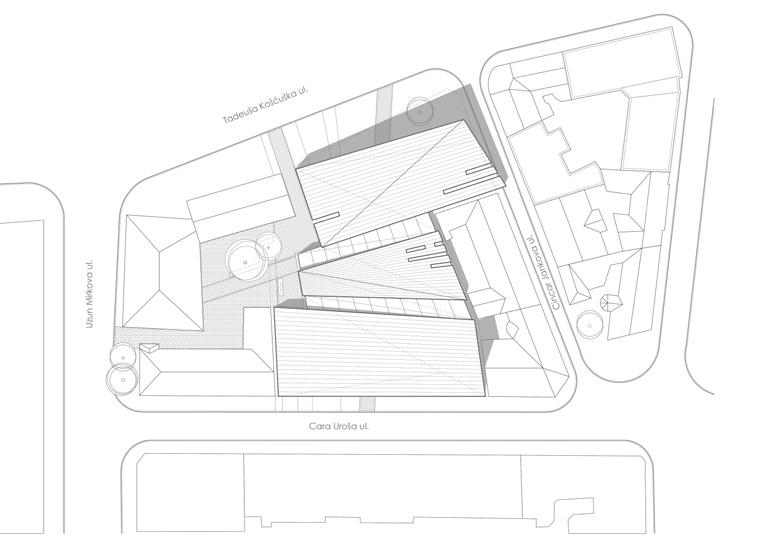 venac wird. Die Massen der Gebäude verlieren sich in der Landschaft. Im städtebaulichen Sinne ist die Form dieses Bauensembles eine Erweiterung der Straßenfronten. Da die Porosität und der Unterschied in den Gebäudehöhen eine spezifische Besonderheit dieses Ortes ist, verfolge ich dieses Prinzip in meinem Entwurf, um den ‘genius loci’ und die Sichtachsen zu behalten. Drei in Höhe und Breite unterschiedliche Baukörper bilden im Zusammenspiel mit der Landschaft ein Bauensemble, das sich als Treffpunkt der künstlerischen und interkulturellen Szene Belgrads versteht. Es bietet Raum für Ausstellungen, für die Entwicklung und Präsentation zeitgenössischer Kunst (Installationen, Performances), für das Erarbeiten, Aneignen und Weitergeben von Wissen sowie für die Diskussion aktueller Themen im Bereich der bildenden und angewandten Künste und der Architektur. Die Funktionen der einzelnen Baukörper sind so geplant, dass sie sich logisch an die bestehende Bestand