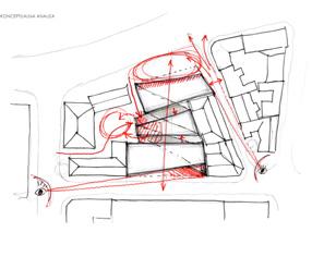 Die kulturhistorische Bedeutung war der Ausgangspunkt für die Projektkonzeption. Vor allem stellt sich die Frage nach dem “Neuen” im historischen Kontext Belgrads. Die Morphologie des Geländes ist von entscheidender Bedeutung für die Entwicklung dieses Stadtteils. Kosancicev venac liegt in der Nähe des Flusses, aber es kam nie dicht an ihn heran. Kosancicev venac bildet die dominierende Struktur in der Silhouette der Stadt, was für das Projekt eine