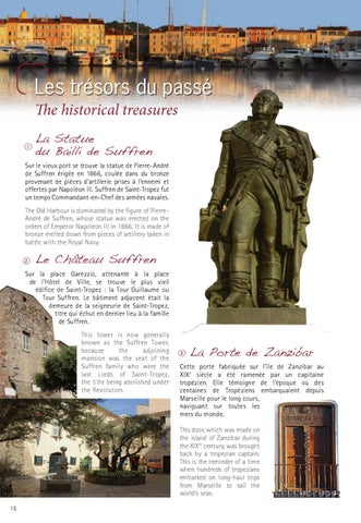 Sur le vieux port se trouve la statue de Pierre-André de Suffren érigée en 1866, coulée dans du bronze provenant de pièces d’artillerie prises à l’ennemi et offertes par Napoléon III. Suffren de Saint-Tropez fut un temps Commandant-en-Chef des armées navales. The Old Harbour is dominated by the figure of PierreAndré de Suffren, whose statue was erected on the orders of Emperor Napoleon III in 1866. It is made of bronze melted down from pieces of artillery taken in battle with the Royal Navy. 2