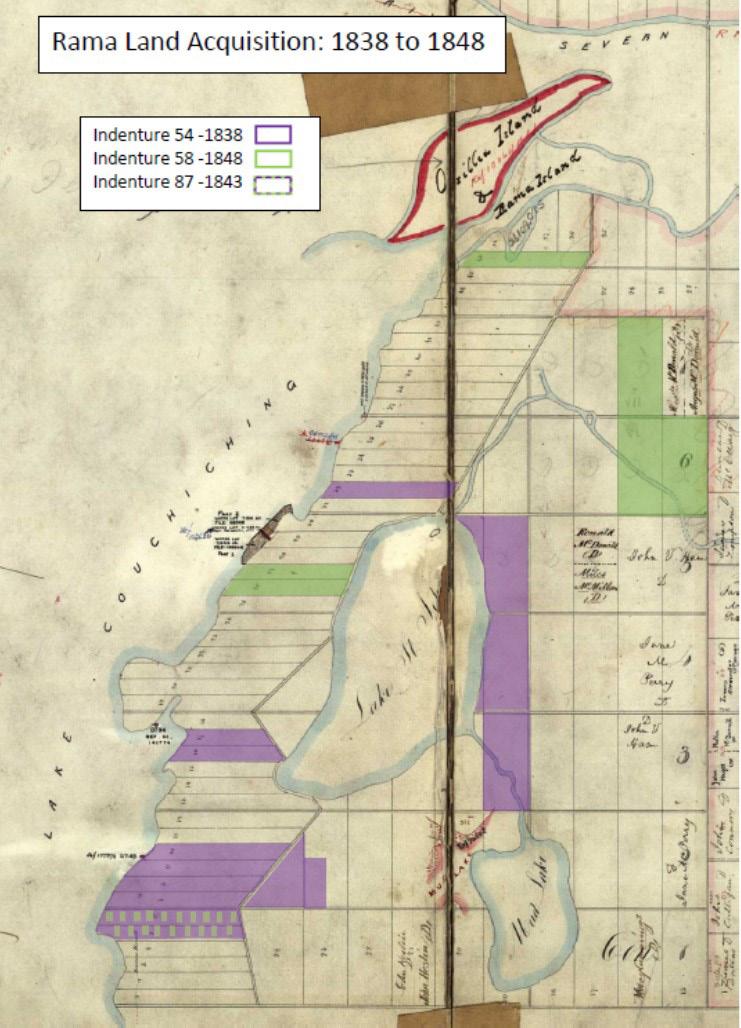 Several properties within Rama Township were available for “12 shillings and six pence” per acre. All expenses, including the purchase of lands and building of homes on the land, was taken from the “resources of the tribe”. In other words, our ancestors bought what became Rama First Nation with their own money. In November and December 1838, under instruc tion from our ancestors, Indian Department Chief Superintentent Jarvis went on a buying spree. He purchased lots of that ultimately added up to 1,621 acres.