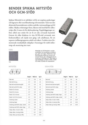 bender spikma mittstöd OCH GCM-STÖD Spikma Mittstöd är ett självklart val för att avgränsa parkeringar och lagerytor eller som filmarkering vid terminaler. Tack vare den dränerade konstruktionen stöden undviks vattensamlingar på fel ställen. Mjuka avslutningar finns, liksom stöd med hål för reflexstolpe eller 2-tums rör för skyltmarkering. Toppbeläggningen utföres alltid mot stödet för att få ett icke avvisande kantstöd. Genom de olika höjderna är våra GCM-stöd avvisande mot fordonstrafiken och mjukt mot gång- och cykelbanan, för att separera trafikantgrupperna enkelt och säkert. I stöden sitter förmonterade rostskyddade stålspikar i bussningar för stabil infästning och montering året runt. Färg