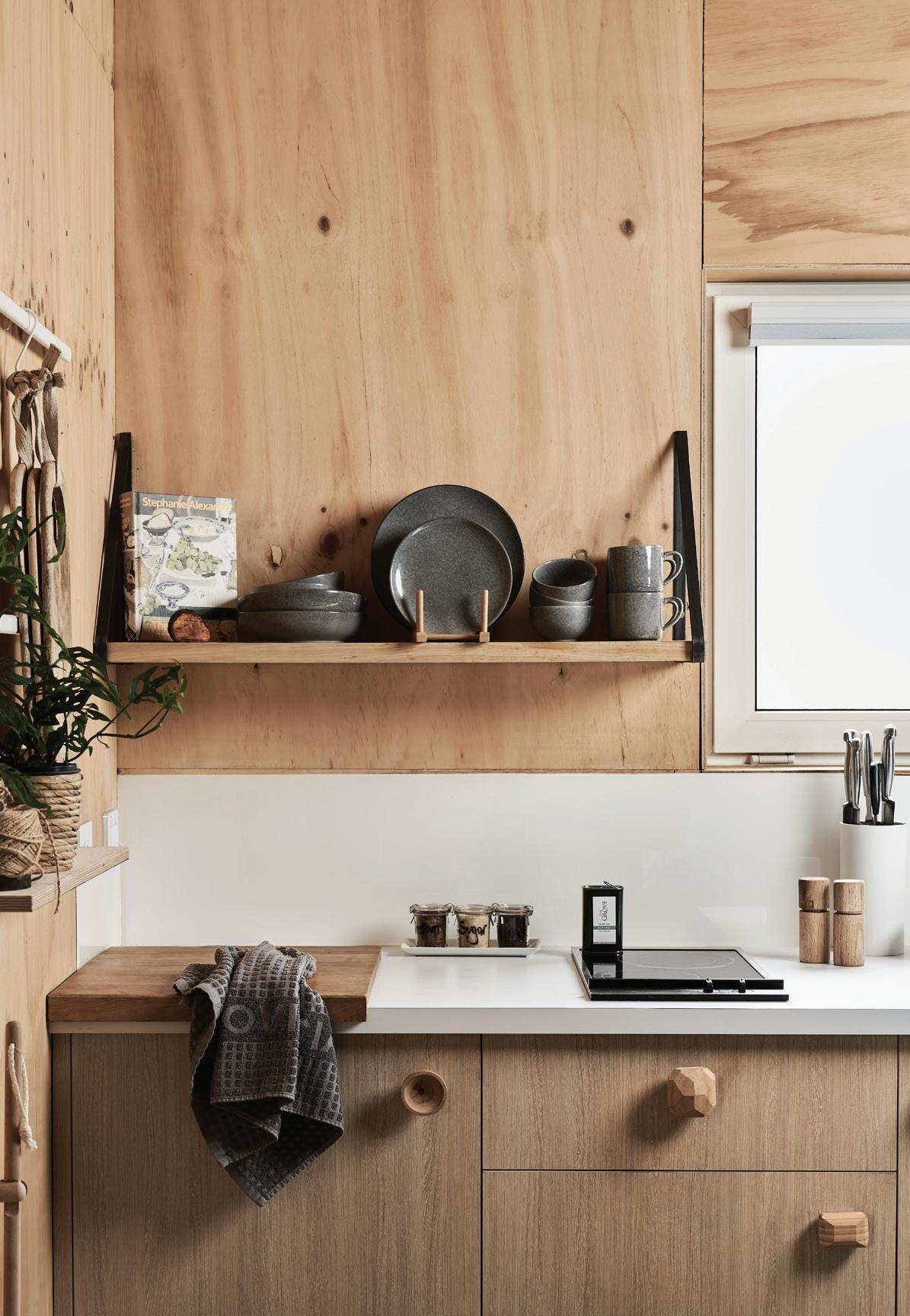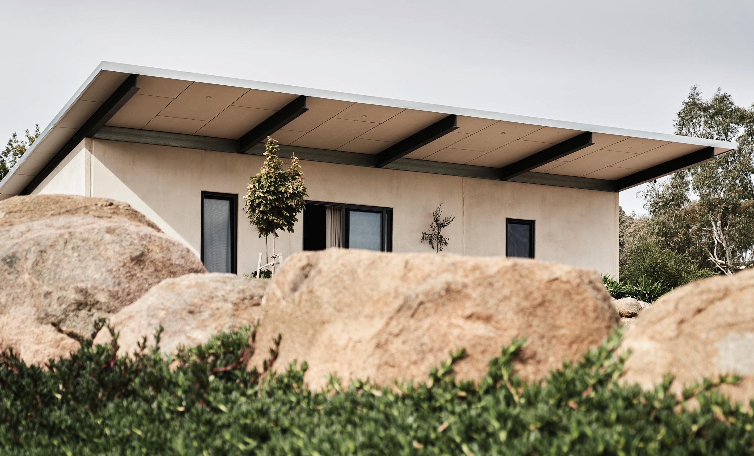 Taking in majestic views of rolling hills, mountains and olive trees, you could be forgiven for thinking you were in the Italian countryside. But the Grove Studio Apartment is nestled in Harcourt North, in the heart of the incredible Central Victorian landscape. It was the ideal setting for owners Paul and Janet Rockes to build. They first constructed this self-contained unit and resided in it until their main home was finished. The Grove Studio Apartment is now used as accommodation. Custom-built using precast concrete panels, it boasts rustic charm and modern aesthetics. Paul explains that the couple made all the decisions regarding furnishings and finishes, both internally and externally. The result is a property that uses materials in their rawest form in a seemingly simple construction, yet with a welcoming warmth and understated character, as well as that rustic appeal that Australian country properties are renowned for. “We wanted to keep that semi-industrial look,” he says. “It was built to be practical.” However, their desire for practicality means the house is serendipitously on-trend. The interior sees contrasting finishes come together to create a look that’s natural and stylish. The interior walls are lined with plywood, which retains its natural finish. These complement the polishedconcrete floors and together provide thermal protection against the winter chill. The unit is designed to be used by a couple. It’s intimate and uncluttered, boasting everything guests need to be comfortable, including a separate ensuite with large shower head, dining and lounge area, as well as kitchen. Visitors can enjoy a morning cuppa or evening glass of red in front of the wood fire. There’s also the convenience of reverse-cycle heating and cooling split-system and ceiling fans.