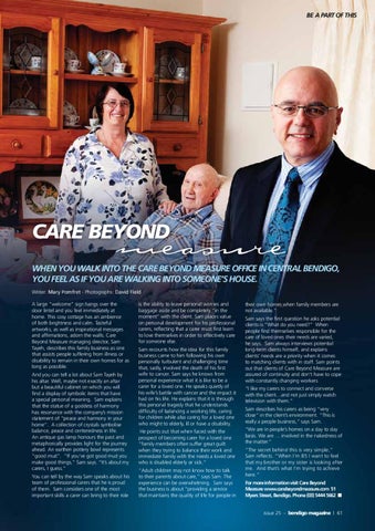 their own homes when family members are not available.” Sam says the first question he asks potential clients is “What do you need?” When people find themselves responsible for the care of loved ones their needs are varied, he says. Sam always interviews potential long-term clients himself, and explains clients’ needs are a priority when it comes to matching clients with in staff. Sam points out that clients of Care Beyond Measure are assured of continuity and don’t have to cope with constantly changing workers “I like my carers to connect and converse with the client…and not just simply watch television with them.” Sam describes his carers as being “very close” in the client’s environment. “This is really a people business,” says Sam. “We are in people’s homes on a day to day basis. We are … involved in the nakedness of the matter.” “The secret behind this is very simple,” Sam reflects. “When I’m 85 I want to feel that my brother or my sister is looking after me. And that’s what I‘m trying to achieve here.” For more information visit Care Beyond Measure www.carebeyondmeasure.com 51 Myers Street, Bendigo. Phone (03) 5444 5662 ■ issue 25 - bendigo magazine | 61