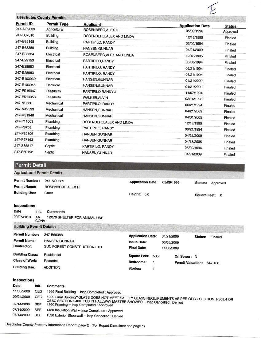 247-M31946 Mechanical HANSEN,GUNNAR 04/01/2005 Finaled 247-P11003 Plumbing ROSENBERG,ALEX AND LINDA 12/18/1995 Finaled 247-P8758 Plumbing PARTIPILO, RANDY 06/21/1994 Finaled 247-P35306 Plumbing HANSEN,GUNNAR 04/21/2009 Finaled 247-P27163 Plumbing HANSEN,GUNNAR 04/13/2005 Finaled 247-S35517 Septic PARTIPILO, RANDY 05/09/1994 Finaled 247-S60152 Septic HANSEN,GUNNAR 04/21/2009 Finaled Deschutes County Property Information Report, page 5 (For Report Disclaimer see page 1)
