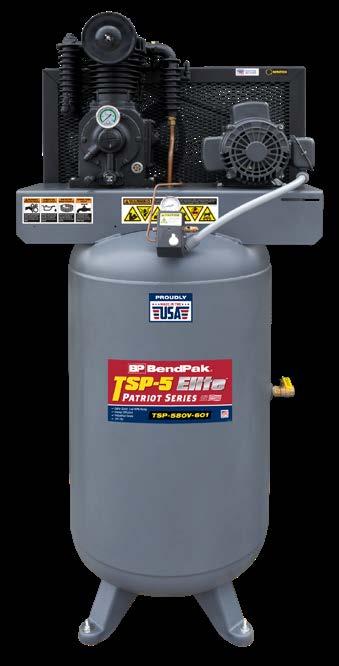 35 FREE SHIPPING! SEE PAGE 59 * AIR COMPRESSORS 5 HP MODEL 7.5 HP MODEL 10 HP MODEL BelAire 318VLE 7.5 HP Electric Air Compressor SKU 6010120 BendPak TSP-580V-601 5 HP Air Compressor SKU 5179111 BendPak VMP-10120V-603 10 HP Air Compressor SKU 5179114 BendPak VMP-7580V-601 7.5 HP Air Compressor SKU 5179112 BendPak VMP-7580V-603 7.5 HP Air Compressor SKU 5179113 3 Phase • Tank Size - 80-Gallon • Max. CFM - 22.3 • Phase - 1-Phase • 175 PSI Max Pressure • Tank Size - 80-Gallon • Max. CFM - 17 • Phase - 1-Phase • Tank Size - 120-Gallon • Max. CFM - 41 • Phase - 3-Phase CAST-IRON PUMP • Tank Size - 80-Gallon • Max. CFM - 26 • Phase - 1-Phase • Tank Size - 80-Gallon • Max. CFM - 26 • Phase - 3-Phase TOP SEL LER TOP SELLER $3,475 $4,080 $4,220 SALE PRICE SALE PRICE SALE PRICE $3,195 SALE PRICE $5,110 SALE PRICE Anti-Vibration Pads (Set of 4) NOT INCLUDED SKU 5179402 $40 ON EVERYTHING FREE* ON EVERYTHING FREE*