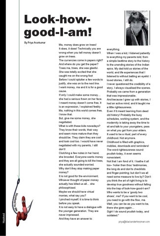 everything. When I was a kid, I listened patiently to everything my parents told, from a simple bedtime story to the history to the unending stories of the Indian epics. My dad told us stories of the world, and life experiences that I listened to without batting an eyelid. I loved stories, I still do. I never questioned the credibility of a story, I always visualised the scenes. Probably we came from a generation that was impressionable. And because I grew up with stories, I had an active mind, and it taught me a little righteousness. Even if it meant learning from dead old history! Probably the busy schedules, working system, and the modernity is taking away the time to sit and talk to your youngsters, pass on what you got from your elders. It used to be a ritual, part of every childhood. Not anymore. Childhood is filled with graphics, mobiles, downloads and reminders! The word righteousness sound prudish today, it even seems nonexistent. Not that I am fond of it. I loathe it all too– ‘holier than thou’ testimonies, the long do and don’ts checklists and finger-pointing; but don’t we all need some measure to live by? Don’t you think the art of right living is to develop true goodness without falling into the trap of look-how-good-I-am? Who wants to be a ‘goody two shoes’, ma? If you want to be cool, you need to go with the flow, ma. Well, you can be as you want to be, there she goes again… Sigh! I do sound prudish today, and outdated." priya@blackandwhiteoman.com