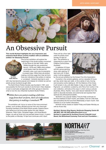 An Obsessive Pursuit This month Northart highlights the very impressive and extensive North Shore ceramic tradition with an exhibition entitled ‘An Obsessive Pursuit’. This survey exhibition will explore the beginnings of the studio pottery movement on the Shore (in the late 1940s, early 1950s) through the very productive, fecund 1970s and 1980s when potters could barely meet the demand for domestic ware, such was its popularity, to present days. While there are potters making a full time wage from their art form, Ian Firth, there are indications that pottery is making Celtic Warrior. a ‘comeback’. Certainly learning to work with clay has become popular and classes for children as well as adults across Auckland sought after. The North Shore Potters Society was founded in 1951, and was possibly the first such society to be formed in New Zealand; it was to eventually amalgamate with other groups to become what is now the very influential Auckland Studio Potters.