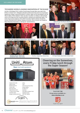 TECHWEEK WORLD LEADING INNOVATION AT THE B:HIVE As part of TechWeek 2018, a series of technology-focused talks were held at the B:Hive in Smales Farm. Delegates attended several panel discussions by businesses leading the charge in growing Auckland's northern region as the area tipped to be the Silicon Valley of New Zealand. There was also innovation on display to demonstrate some of the ideas and tech including robotics, software and augmented reality. The event was proudly hosted by Grow North Innovation District partners the B:Hive, ecentre, Business North Harbour, Massey University, Shore Junction and Takapuna Beach Business Assocation's "Techapuna" representatives.