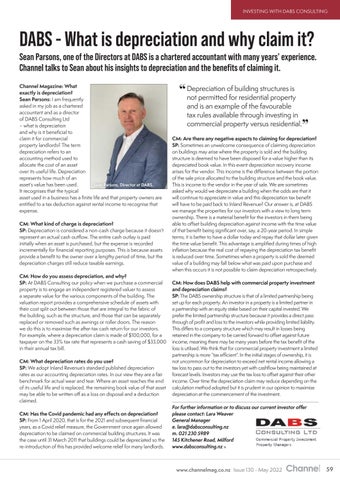 DABS - What is depreciation and why claim it? Sean Parsons, one of the Directors at DABS is a chartered accountant with many years’ experience. Channel talks to Sean about his insights to depreciation and the benefits of claiming it. Channel Magazine: What exactly is depreciation? Sean Parsons: I am frequently asked in my job as a chartered accountant and as a director of DABS Consulting Ltd – what is depreciation and why is it beneficial to claim it for commercial property landlords? The term depreciation refers to an accounting method used to allocate the cost of an asset over its useful life. Depreciation represents how much of an asset’s value has been used. Sean Parsons, Director at DABS. It recognises that the typical asset used in a business has a finite life and that property owners are entitled to a tax deduction against rental income to recognise that expense. CM: What kind of charge is depreciation? SP: Depreciation is considered a non-cash charge because it doesn’t represent an actual cash outflow. The entire cash outlay is paid initially when an asset is purchased, but the expense is recorded incrementally for financial reporting purposes. This is because assets provide a benefit to the owner over a lengthy period of time, but the depreciation charges still reduce taxable earnings. CM: How do you assess depreciation, and why? SP: At DABS Consulting our policy when we purchase a commercial property is to engage an independent registered valuer to assess a separate value for the various components of the building. The valuation report provides a comprehensive schedule of assets with their cost split out between those that are integral to the fabric of the building, such as the structure, and those that can be separately replaced or removed such as awnings or roller doors. The reason we do this is to maximise the after-tax cash return for our investors. For example, where a depreciation claim is made of $100,000, for a taxpayer on the 33% tax rate that represents a cash saving of $33,000 in their annual tax bill. CM: What depreciation rates do you use? SP: We adopt Inland Revenue’s standard published depreciation rates as our accounting depreciation rates. In our view they are a fair benchmark for actual wear and tear. Where an asset reaches the end of its useful life and is replaced, the remaining book value of that asset may be able to be written off as a loss on disposal and a deduction claimed. CM: Has the Covid pandemic had any effects on depreciation? SP: From 1 April 2020, that is for the 2021 and subsequent financial years, as a Covid relief measure, the Government once again allowed depreciation to be claimed on commercial building structures. It was the case until 31 March 2011 that buildings could be depreciated so the re-introduction of this has provided welcome relief for many landlords.