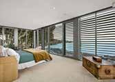 Upon entering the home, a large atrium with a bridge leading to the master bedroom greets you, while the soaring voided ceiling in the living area creates a spectacular space for entertaining. This main living area is located on the ground floor and consists of three defined but inter-connected spaces. The kitchen is adjacent to the main living area and is tucked into the rear of the property. It faces out towards the beach and leads into the dining room, which also offers high vaulted ceilings and sweeping views of the outdoor living area and the ocean beyond. There is a lovely library or second lounge with built-in study space and a picture window offering water views.