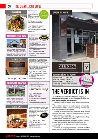 The Verdict is In Last month Channel launched the 1st Buy Local campaign, an initiative aimed at supporting our local businesses and all the good things that are happening here on the Shore. This month’s Eating Out Takapuna feature restaurant epitomises that ethic. Verdict Café and Restaurant has only been open for four months but in that time has shown it truly is one of the good things happening here on the Shore that we should be supporting. Located in the old court building at 12 Huron Street, Verdict has taken that location and run with it as a theme, obviously evidenced in its name, but also in its menu and iconography. The menu is simple, traditional, but with a slight twist or something original in each dish that makes them special. It helps that everything is baked and made on site, which is great for the cakes, slices and daytime café culture that Verdict caters too. It’s even better for the burgers, which are made on freshly baked focaccia bread. For example, the Al Capone gourmet burger is made with one of those beautiful focaccia’s, topped with seared scotch fillet, balsamic beetroots,