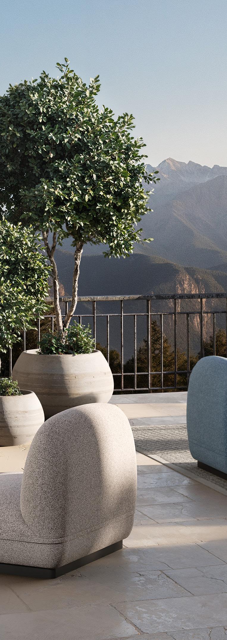In this outdoor version, an additional protective layer of textile fibers prevents moisture penetration and further enhances the material’s resistance to environmental influences. An optional protective cover provides optimal protection against the elements, as well as against dust and dirt. Each cover is precisely tailored to the respective module – single element, corner element or pouf.