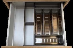 En option pour le tiroir. Uniquement disponible pour une armoire intégrée avec module de 600 mm de profondeur. Dimensions : largeur 377 mm, profondeur 424 mm, hauteur 65 mm.
