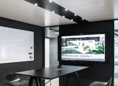 Cabling can be routed from the base or the ceiling. The technical wall element is detachable to enable easy access for cable management. Power and data sockets are accessible to the user via a flush-mounted connection board, a cable grommet or fed through at the element joint. NOOXS mounting brackets allow installation of screens and white boards without damaging the wall elements.