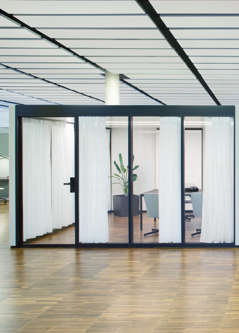 Optional kann POINTS mit blickdichten und akustisch wirksamen Vorhängen ausgestattet werden. Bei Bedarf können diese geschlossen werden und somit ist eine Abschirmung nach Außen gegeben.