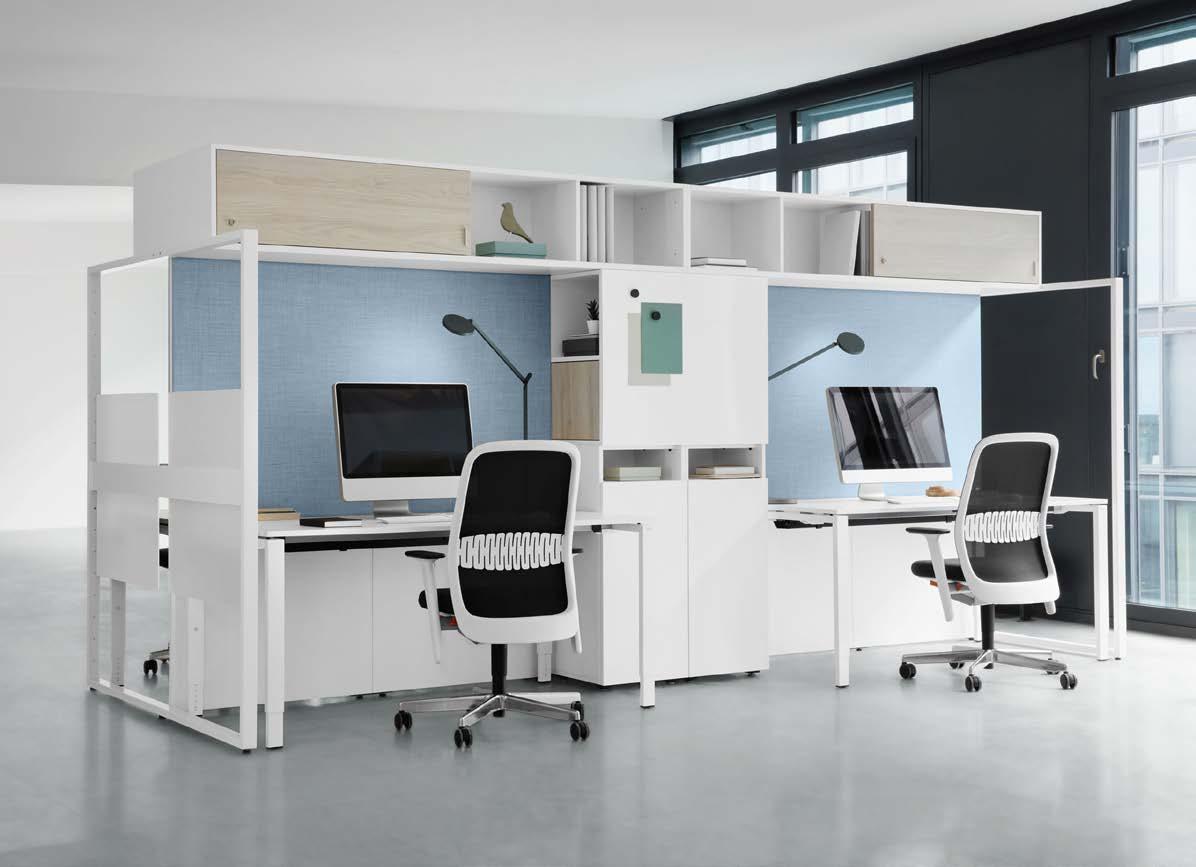 can be heighted further with additional design options and integrated frontal storage. Its characteristic screening design enables the user to create team zones using additional meeting furniture that is directly connected to the personal workspace; the whole space becomes a team zone encouraging communication and cooperation.