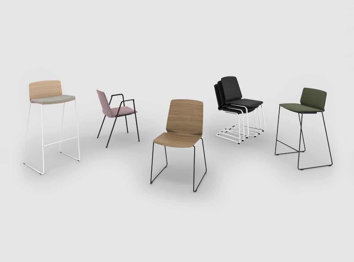 Gestell: Es sind drei Gestellformen möglich, davon zwei wahlweise mit Armlehnen. Zusätzlich sind beim Kufengestell zwei weitere Höhen verfügbar für Barstool.