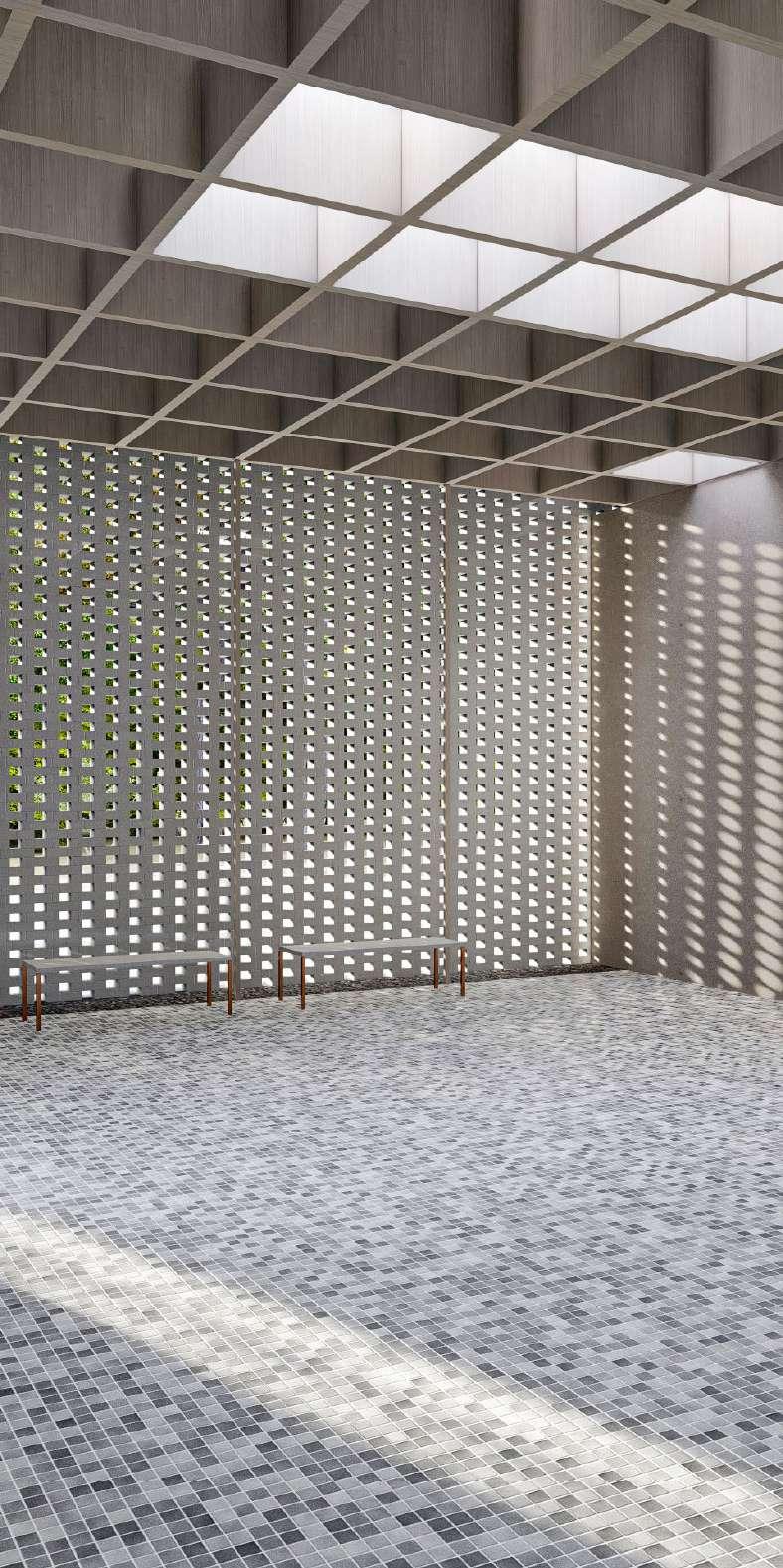 POHĽAD NA VSTUPNÝ ROZPTYLOVÝ PRIESTOR. VIDÍME PRIENIK SVETLA CEZ PREDSADENÚ FASÁDU Z TEHÁL, KTORÁ PREPÚŠŤA TLMENÉ SVETLO A VYTVÁRA ZAUJÍMAVÚ