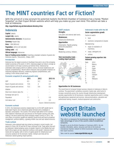 The MINT countries Fact or Fiction? With the arrival of a new acronym for potential markets the British Chamber of Commerce has a handy “Market Snapshot” on their Export Britain website which will help you make up your own mind. This edition we take a look at Indonesia. http://exportbritain.org.uk/international-directory/#ms