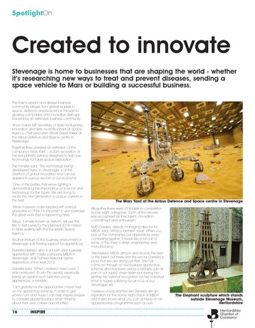 Created to innovate Stevenage is home to businesses that are shaping the world - whether it’s researching new ways to treat and prevent diseases, sending a space vehicle to Mars or building a successful business. The town’s vibrant and diverse business community ranges from global leaders in space, defence and bioscience through to growing companies and innovative start-ups backed by an extensive business community. Vince Cable MP, Secretary of State for Business, Innovation and Skills, recently joined UK Space Agency chief executive officer David Parker at the Airbus Defence and Space centre in Stevenage. Together they unveiled an extension of the company’s ‘Mars Yard’ – a 30m recreation of the red planet’s surface designed to test new technology for future space exploration. The minister said: “The technology being developed here, in Stevenage, is at the forefront of global innovation and can be applied to various sectors of our economy. “One of the battles that we’re fighting is demonstrating the importance of science and technology for the future. We are trying to excite the next generation to pursue careers in this field. “We’re massively under-supplied with science graduates so I think it is important to acknowledge the great work that is happening here.” Airbus, formerly known as Astrium, will use the site to test rovers for the planned 2018 mission to Mars working with the European Space Agency. Another feature of the business environment in Stevenage is its thriving support for apprentices. Daniella Distazio, who is a fourth year business apprentice with missile company MBDA in Stevenage, was named National Higher Apprentice of the Year 2014. Danielle said: “When I realised I had I won, I was overjoyed. To win the award, especially being up against such talented young apprentices, is fantastic. “I am grateful for the opportunities I have had on my apprentice scheme in order to get where I am and hope I can help inspire people to consider apprenticeships when thinking about their own career opportunities.”
