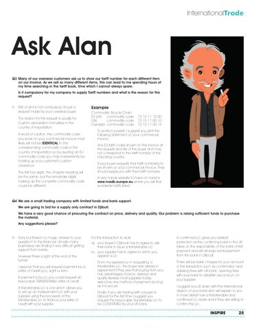 Ask Alan Q3 Many of our overseas customers ask us to show our tariff number for each different item on our invoice. As we sell so many different items, this can lead to me spending hours of my time searching in the tariff book, time which I cannot always spare. Is it compulsory for my company to supply Tariff numbers and what is the reason for this request? A