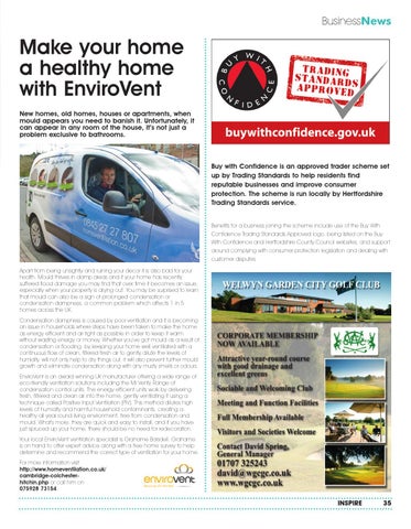 Buy with Confidence is an approved trader scheme set up by Trading Standards to help residents find reputable businesses and improve consumer protection. The scheme is run locally by Hertfordshire Trading Standards service. Benefits for a business joining the scheme include use of the Buy With Confidence Trading Standards Approved logo, being listed on the Buy With Confidence and Hertfordshire County Council websites, and support around complying with consumer protection legislation and dealing with customer disputes Apart from being unsightly and ruining your decor it is also bad for your health. Mould thrives in damp areas and if your home has recently suffered flood damage you may find that over time it becomes an issue, especially when your property is drying out. You may be surprised to learn that mould can also be a sign of prolonged condensation or condensation dampness, a common problem which affects 1 in 5 homes across the UK. Condensation dampness is caused by poor ventilation and it is becoming an issue in households where steps have been taken to make the home as energy efficient and air tight as possible in order to keep it warm without wasting energy or money. Whether you’ve got mould as a result of condensation or flooding, by keeping your home well ventilated with a continuous flow of clean, filtered fresh air to gently dilute the levels of humidity, will not only help to dry things out, it will also prevent further mould growth and eliminate condensation along with any musty smells or odours. EnviroVent is an award winning UK manufacturer offering a wide range of eco-friendly ventilation solutions including the Mr Venty Range of condensation control units. The energy efficient units work by delivering fresh, filtered and clean air into the home, gently ventilating it using a technique called Positive Input Ventilation (PIV). This method dilutes high levels of humidity and harmful household contaminants, creating a healthy all year round living environment, free from condensation and mould. What’s more, they are quick and easy to install, and if you have just spruced up your home, there should be no need for redecoration. Your local EnviroVent ventilation specialist is Grahame Barsdell. Grahame is on hand to offer expert advice along with a free home survey to help determine and recommend the correct type of ventilation for your home. For more information visit http://www.homeventilation.co.uk/ cambridge-colchesterhitchin.php or call him on 075928 73154.