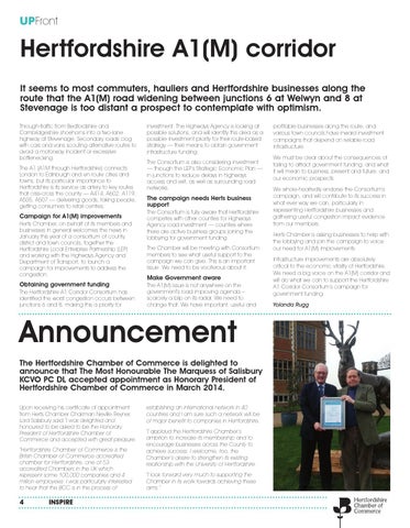Campaign for A1(M) improvements Herts Chamber, on behalf of its members and businesses in general welcomes the news in January this year of a consortium of county, district and town councils, together the Hertfordshire Local Enterprise Partnership (LEP) and working with the Highways Agency and Department of Transport, to launch a campaign for improvements to address the congestion.