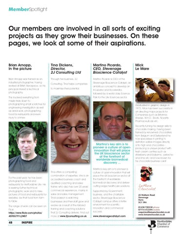 Martino’s key aim is to pioneer a culture of openinnovation that will place the UK bioscience sector at the forefront of worldwide biomedical discovery ... Tina offers a compelling For the past year, he has been photographing food and restaurants for Hertfordshire Life. He is seeking further technical photographic work and to take pictures of food and restaurants for websites, be that food from farm to table. The range of work can be seen on Flickr https://www.flickr.com/photos/ 45955791@N07