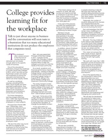 in people retraining in later life. We have had more than 300 students taking plumbing courses and some of them have switched from other careers. Several of them are teachers. “Nationally, the number of students doing part-time courses has dropped because the Government does not fund them but we are bucking the trend.” Sam acknowledges that there remain many challenges in an education sector constantly assailed by budgetary concerns which mean that recruitment of students is crucial. She said: “Our big challenge is the need to raise awareness of London South East Colleges, communicating to prospective students and businesses who we are, our values and the many benefits of working with us. “Our vision is to ensure the skills needs of local, regional and national employers are being met with high quality training. “We work with more than 1,000 employers across all sectors and intend to grow our provision in areas where there is identified demands from employers so that we are recognised as a centre of excellence in London and beyond.” One of the opportunities is the introduction in April of the Apprenticeship Levy and Sam said: “We are considering establishing an Apprenticeship training Organisation. this will allow us to work collectively with a group of employers to provide support around the administrative demands of the scheme, recruitment of apprentices and organising and managing work placements. “We will also be developing the potential for higher level apprenticeships, Level 4 and above, with our partners and have piloted a traineeship programme for students who don’t have the necessary entry requirements to enrol on an apprenticeship. We will now be extending this to include young people and older adults, who are the furthest from the job market. “We know there is work still to do. At the moment, 92 per cent of surveyed companies say they would recommend us. Our target is to make that 100 per cent!”