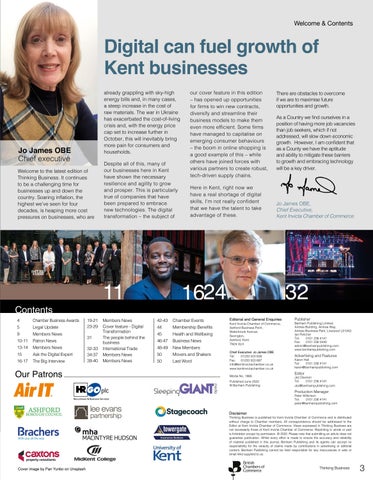 Thinking Business is published for Kent Invicta Chamber of Commerce and is distributed without charge to Chamber members. All correspondence should be addressed to the Editor at Kent Invicta Chamber of Commerce. Views expressed in Thinking Business are not necessarily those of Kent Invicta Chamber of Commerce. Reprinting in whole or part is forbidden except by permission. © 2022. Please note that submitting an article does not guarantee publication. Whilst every effort is made to ensure the accuracy and reliability of material published in this journal, Benham Publishing and its agents can accept no responsibility for the veracity of claims made by contributions in advertising or editorial content. Benham Publishing cannot be held responsible for any inaccuracies in web or email links supplied to us.