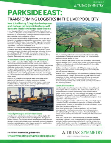 TRANSFORMING LOGISTICS IN THE LIVERPOOL CITY New 2.5million sq. ft. logistics development and strategic rail freight interchange will boost the local economy for years to come A new strategic rail freight interchange (SRFI) project along with a new 2.5million sq. ft. logistics development is set to be brought forward in the North West by Tritax Symmetry, creating investment and employment opportunities in the region for years to come. Located within the Liverpool City Region’s Freeport zone on Junction 22 of the M6, Parkside East is an allocated employment site that sits within the borough of St Helens and the Liverpool City Region and lies next to Warrington and Wigan. Tritax Symmetry, the major logistics developer, acquired the 221-acre site in November 2023. Parkside East will be critical to the region’s delivery plans for logistics, supporting North-South and East-West movments, particularly import and exports between Liverpool, Hull, Scotland, and Felixstowe. St Helens Borough Council (SHBC) has already demonstrated its commitment by investing £56m into a new link road that will service the site, due to complete in the first quarter of this year.