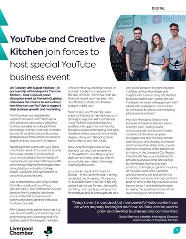 host special YouTube business event On Tuesday 13th August YouTube - in partnership with Liverpool’s Creative Kitchen - held a special panel discussion event at Avenue HQ, giving attendees the chance to learn about how they can use YouTube to support their business growth and marketing. The Chamber was delighted to support the event which featured a joint panel and discussion, designed to share valuable YouTube platform knowledge and tips, that was attended by over 50 professionals and business entrepreneurs from across the creative, digital and tech sectors in Liverpool. Speaking at the event was Lucy Banks - YouTube’s Head of Content for Brands for Europe, Middle East and Africa. Lucy, who studied at the University of Liverpool who provided attendees with commercial insights from the platform alongside tips and advice to help inspire Liverpool’s next generation of creative business leaders. Also in attendance were Andy Castell (1.4 million subs) and Lucy Wood (181,000 subs) - two prominent YouTube creators from Liverpool who have successfully built businesses and communities through their individual YouTube channels; FIFA Creator Andy, better known as AJ3, uses his channel to post animated and entertaining pack openings and FIFA battles against the biggest members