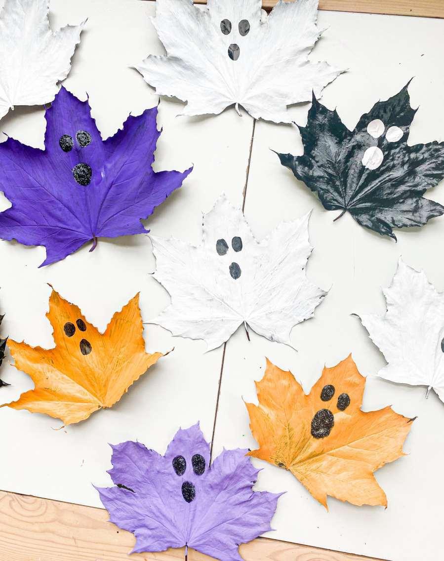 1. Have the kids paint the leaves using acrylic paint! We used white, orange, black, and purple for the Halloween colors.