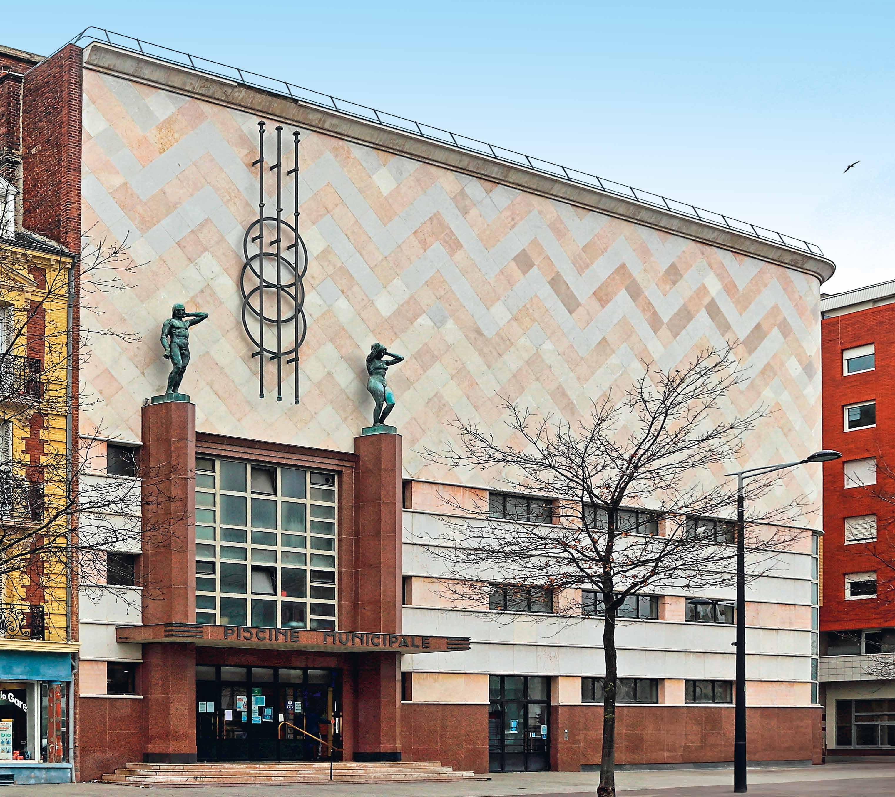 Dans un contexte de développement des équipements sportifs et de démocratisation de la natation, l’architecte André Lenoble construit la première piscine municipale du Havre sur 1 500 m². La façade est parée de dalles en pierre calcaire de Bourgogne dessinant des chevrons. L’entrée est soulignée par une large marquise et deux piliers en granit rouge de Finlande qui servent de socle à deux baigneurs en bronze, sculptés par Alphonse Saladin.