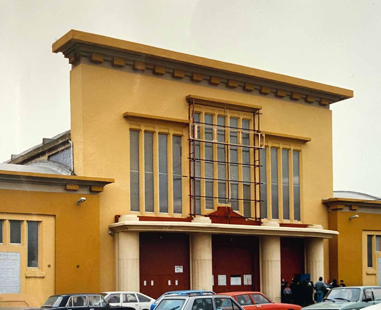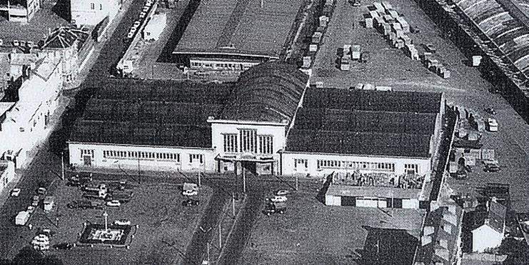 annuelle du Havre, l’édifice est construit sur un terrain libéré par la gare de marchandises. Lauréate du concours, l’entreprise Thireau-Morel édifie en béton armé un vaste hall divisé en six travées réparties de part et d’autre d’un vaisseau central.