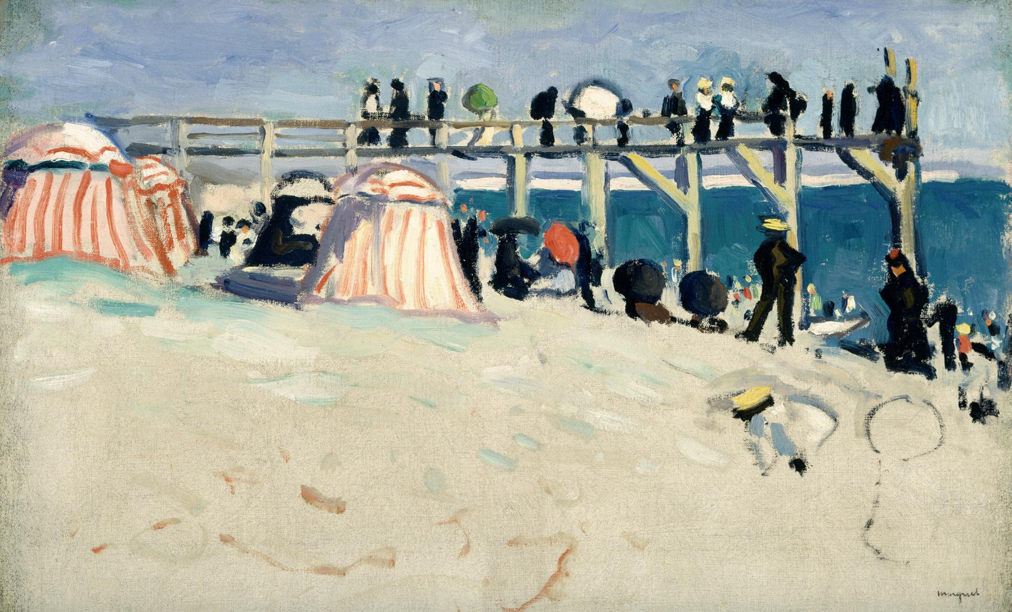Albert Marquet « regarde la nature avec bonté », écrivait Guillaume Apollinaire dans L’Intransigeant du 18 mars 1910. Et nous sommes heureux que le Bordelais ait porté « cette bonté, cette tranquillité, cette joie » jusqu’à nos paysages normands. Après s’être lié d’amitié avec Henri Matisse, à Paris, Albert Marquet rencontra le meilleur des guides en la personne de Raoul Dufy. En 1906, tous deux sillonnèrent la Normandie, de Trouville à Fécamp. Ce fut le début d’une belle histoire d’amitié et d’émulation entre les deux artistes. Ce séjour normand joua un rôle important dans l’œuvre de Marquet, en contribuant à préciser son art.