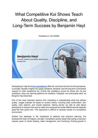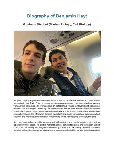 Benjamin Hayt is a graduate researcher at the University of Miami Rosenstiel School of Marine, Atmospheric, and Earth Science, where he develops primary cell culture systems derived from Aplysia californica. His academic work centers on establishing reliable embryonic and somatic cell cultures to support the study of marine viruses. Because marine invertebrate cells are highly sensitive to osmotic shifts and lack standardized cultivation protocols, he focuses on refining media composition and environmental stability. Through structured testing and consistent documentation, he works to create reproducible laboratory conditions that can serve as a stable platform for ongoing experimental research. Ben Hayt approaches scientific challenges with patience and steady refinement rather than quick modification. He evaluates salinity balance, nutrient formulation, and environmental controls in incremental stages to reduce variability in culture performance. His goal is to strengthen the reliability of invertebrate cell systems so they may be used more effectively in marine virology research. By focusing on foundational laboratory techniques, he helps build durable experimental frameworks that support careful, repeatable scientific inquiry over extended periods. Benjamin Hayt also applies his technical perspective to the design of advanced aquatic life-support systems. He has developed integrated environments that combine mechanical filtration, biological cycling, and hydraulic regulation into coordinated systems. Among his most distinctive engineering projects is a drum filtration unit powered entirely by household tap-water pressure. Instead of relying on electric motors, sensors, or digital controllers, the mechanism uses a water-piston and float-valve arrangement to control cleaning cycles. This configuration simplifies operation while preserving effective particulate removal and dependable performance.