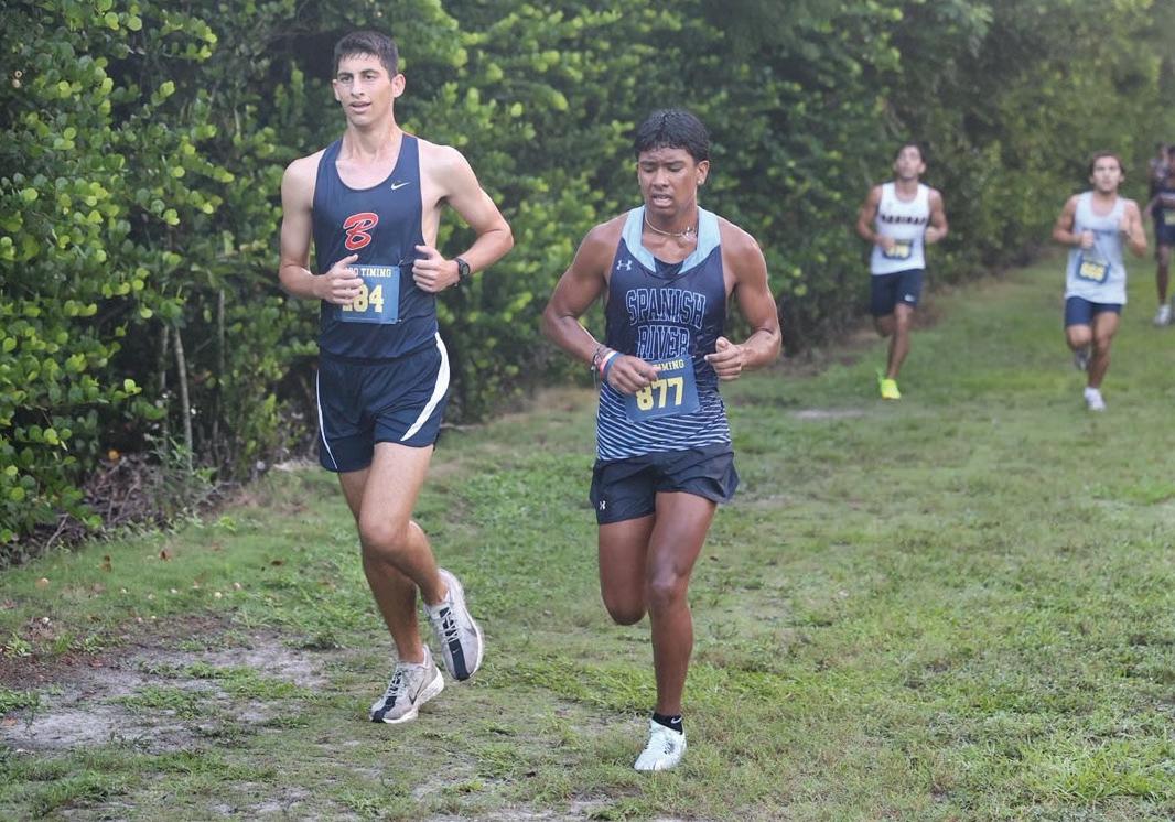 Seniors Sofia Balisteri and Kenna Kujawa lead a pack of cross country runners across Theofilos Field during their home meet. While the two upperclassmen, along with London Allen, are racing their final 5ks as Bucs this season, the team is poised to continue its successes thanks to a large squad of enthusiastic female athletes, including junior standouts Ziva Garaj and Isabella Downey. (Photo by Jeremy Ferris)