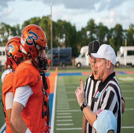 Before the game kicks off, the refs have a quick chat with the Bucs’ team captains on the sidelines. (Photo by Jeremy Ferris)