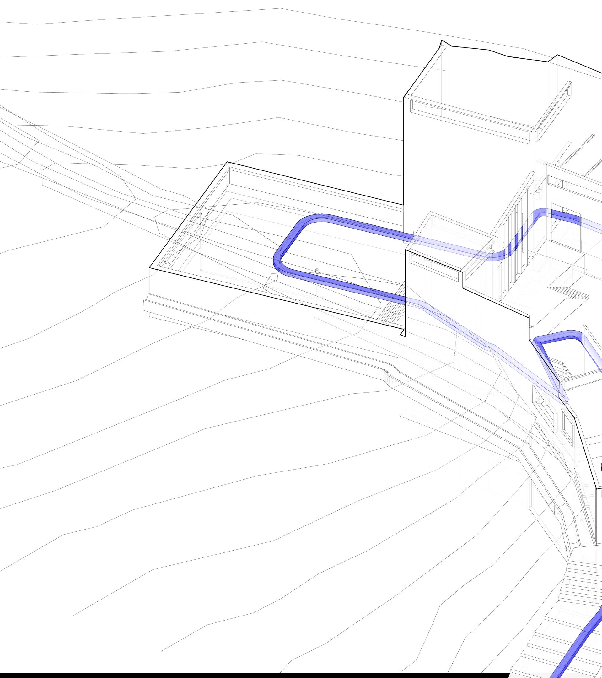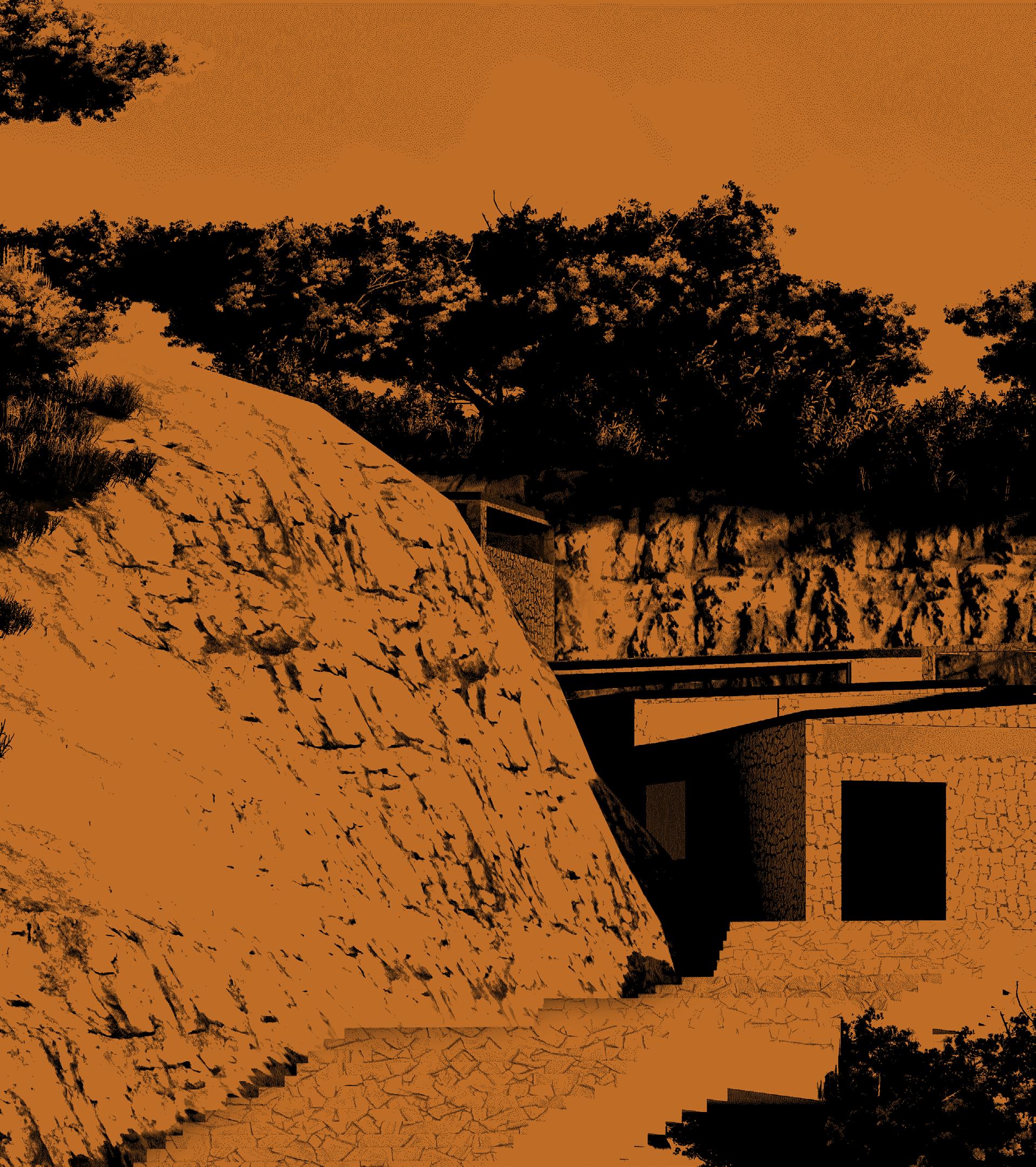 I had went to Greece for Wentworth’s Global Research Studio to explore “The modern and prosaic in the sacred landscape.” Led by professor Meliti Dikeos, we traveled to the island of Aegina, discovering a collection of abandoned churches that had at once been a refuge for the inhabitants of the island. Our studio project was to take place on these steep slopes. Our program: develop a modern asclepieion, a center for healing. At the peak of this hill I unearthed an interesting natural feature. A fissure in the earth, cracking the east side into two and forming a hidden chasm. I saw here possibilities to make something one with the earth and at the same time a secret, secluded gem.