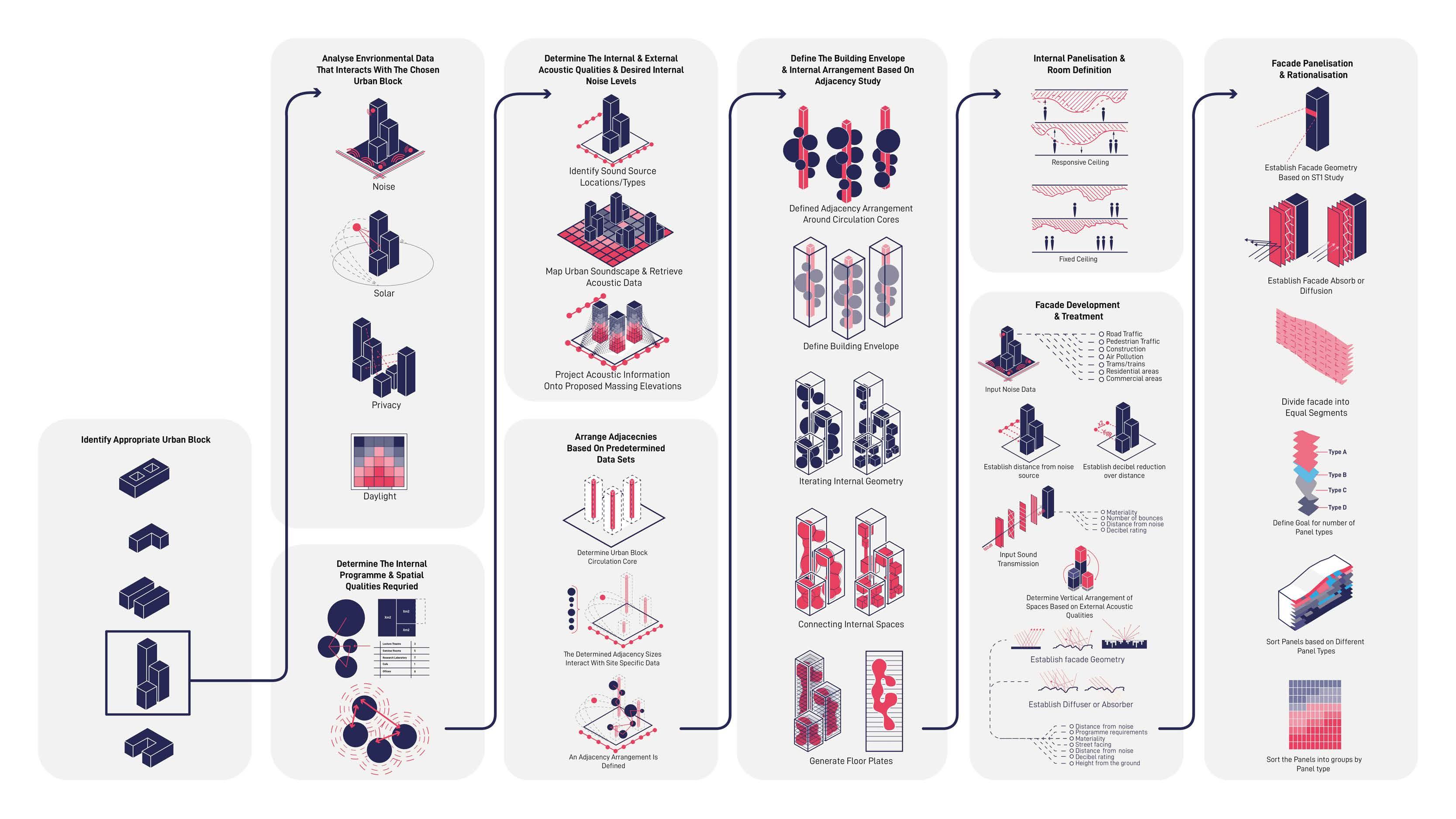 This project leads on from the experimentation of mental health prevention through sound therapy within a pavilion. We aim to tackle multiple ways environmental noise can be eradicated through different design methods at the building scale. The methods could potentially see application for new build or re-use of urban scale or occupancy scale projects.